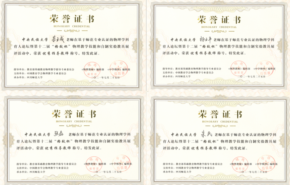 新聞網訊 近日,基于師范專業認證的物理學科育人論壇暨全國第十二屆“格致杯”物理師范生教學技能交流展示活動在四川師范大學舉辦。我校理學院2名學生榮獲教學技能展評一等獎,1名學生榮獲創新實驗設計與自制教具一等獎;教師蘇玉成、楊玉平、張磊、朱民榮獲“優秀指導教師”稱號;帶隊老師朱民再次被邀擔任國家級賽事評委,并主持優秀選手展示活動分會場,對學校進行了介紹和宣傳。師生的優異表現充分展示了民大人的精神風貌和我校學科教學研究生培養質量。