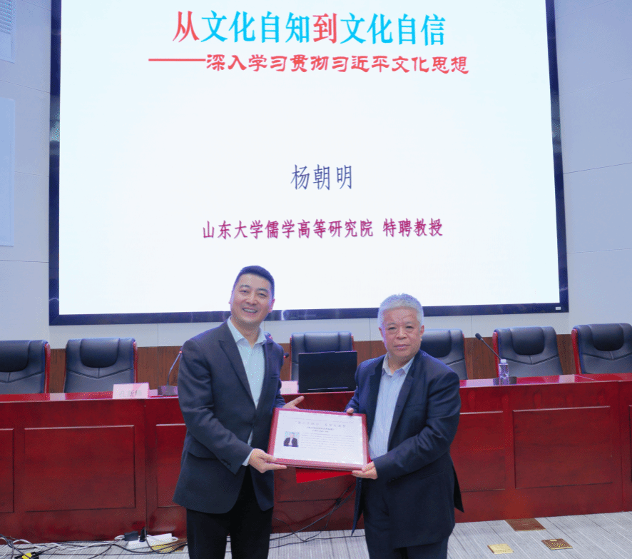 新聞網訊 3月26日晚,由習近平文化思想研究中心中央民族大學協同研究基地、中央民族大學馬克思主義學院主辦的“第二個結合”名家大講堂系列講座第二講,在豐臺校區綜合樓東區報告廳舉辦。全國人大代表、山東大學儒學高等研究院特聘教授、原中國孔子研究院院長楊朝明先生應邀圍繞“從文化自知到文化自信”主題進行現場講授。基地副主任兼秘書長、馬克思主義學院黨委書記兼院長孔新峰為楊朝明先生頒發特聘研究員聘書,頒贈“第二個結合”名家大講堂紀念牌,并主持講座。校內外百余名師生參加現場講座學習。