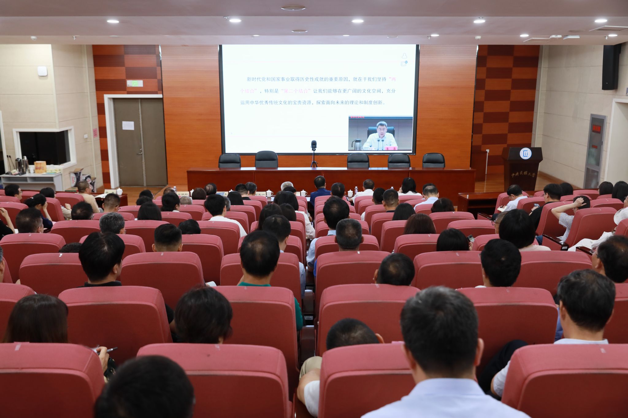 我校校領導、黨委常委,學校副處級以上黨員干部在海淀校區(qū)文華樓一層報告廳分會場參會。