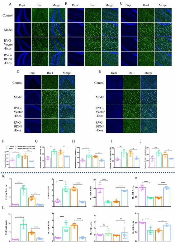 圖4 RVG-BDNF-Exos可減輕抑郁樣行為小鼠的小膠質細胞數量和神經炎癥