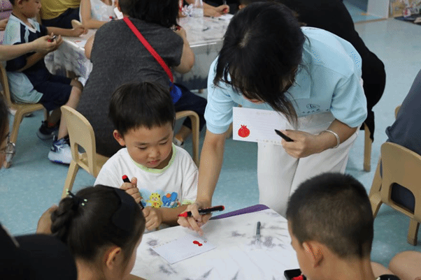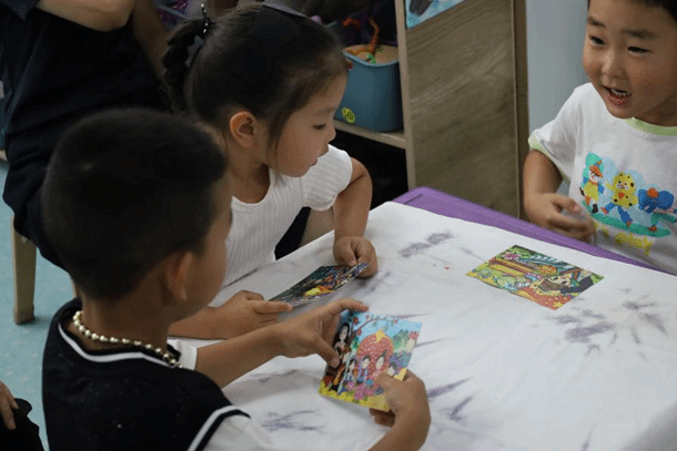 “我們一起來畫石榴好不好?”烏拉特中旗第二幼兒園內,小朋友們的興趣瞬間被調動了起來,用稚嫩的筆觸一筆一畫描繪出一顆顆圓滾滾的石榴。團隊成員通過講解石榴籽的寓意,巧妙引出了“四個與共”的共同體理念。而這些畫上石榴的明信片更是獨一無二、巧具匠心,其背景圖案由民大研支團服務地云南省思茅第一小學的學生們親手繪制,跨越千山萬水而來。來信與回信之間,西南與北疆的情誼被緊密相連,這不僅是一顆顆童心對民族團結最純真的詮釋,更是對“大中小幼”一體化“鑄牢”教育實踐體系最生動的刻畫。