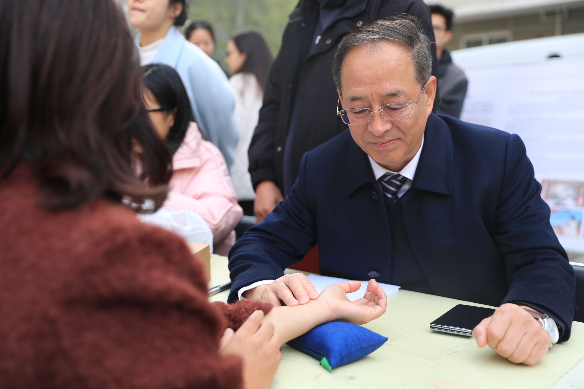 “名醫(yī)義診區(qū)”內(nèi),藥學(xué)院院長(zhǎng)龐宗然為師生診脈。