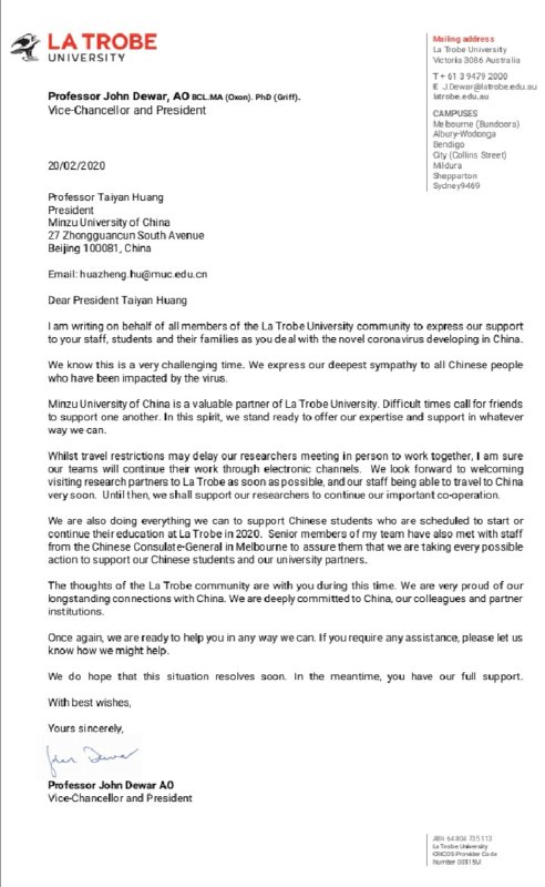 在舉國抗擊新冠肺炎疫情關鍵時刻,海外合作院校的鼓勵和支持體現了雙方的友誼和互信,同時也更加堅定我們戰勝疫情的決心。