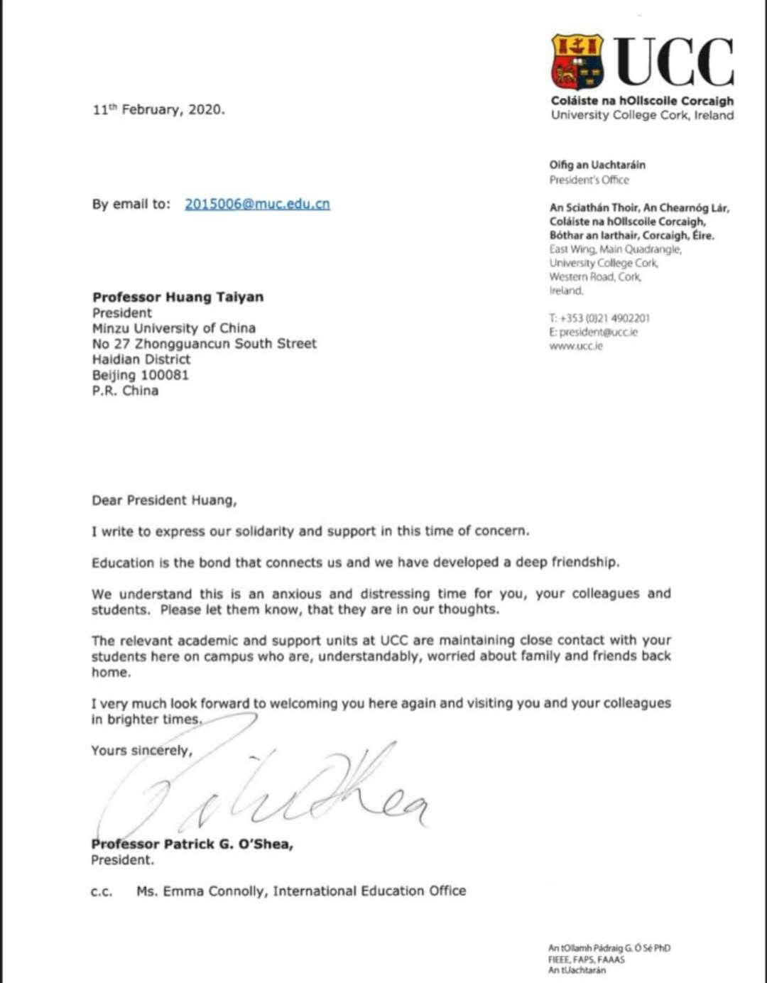 愛爾蘭國立科克大學校長帕特里克?歐西亞教授致信黃泰巖校長,表示兩校通過教育的紐帶緊密聯系,建立了深厚的友誼。在這充滿焦慮和艱難的時刻,希望能夠轉達對全校師生的深切關懷,衷心祝愿我校師生平安順遂,并堅信在大家的共同努力下,終將戰勝困難,渡過難關。同時,科克大學生物地球環境科學學院的院長安德魯?威勒教授錄制了視頻給我校生命與環境科學學院中外合作辦學班的學生,表示將給予該班師生最大支持,祝愿所有人早日攻克疫情,恢復正常學習生活秩序。